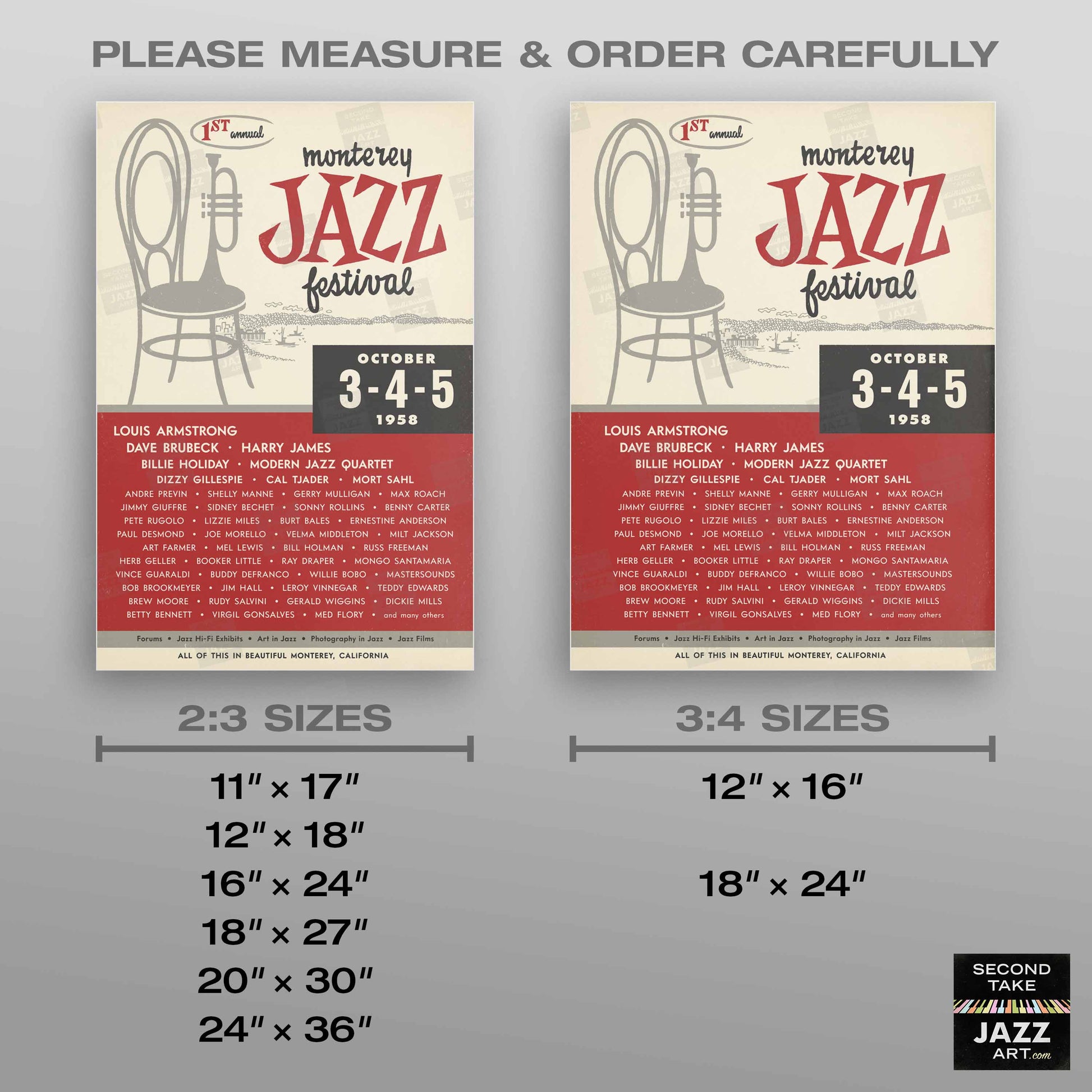 5) Perfectly imperfect. In general, our posters look what we like to call "PERFECTLY IMPERFECT." The events they publicize occurred in the distant past, and therefore the original source materials from which they derive often include not-so-minor COSMETIC FLAWS — folds, creases, scratches, spots, marks, smears, ghosting, discolorations, printing glitches, etc. In addition, some of the primary vintage advertising pieces contain TYPESETTING ERRORS — mistakes, typos, misspellings, etc. We elect to leave almost all of these issues INTACT. This serves to reflect the rushed nature of publicizing live jazz (with its often hurried programming and last-minute personnel changes), and when names are misspelled, these goofs reveal how some of the now-famous participants were still relatively early in their careers and not yet widely known. We always aim to strike a balance when preparing these "antique" materials for modern printing — holding onto their nostalgic, vintage-looking charm as much as possible — "warts and all" — while fixing issues primarily when they significantly hinder legibility. (Please be sure to ZOOM IN on our preview images to examine each poster closely.)
