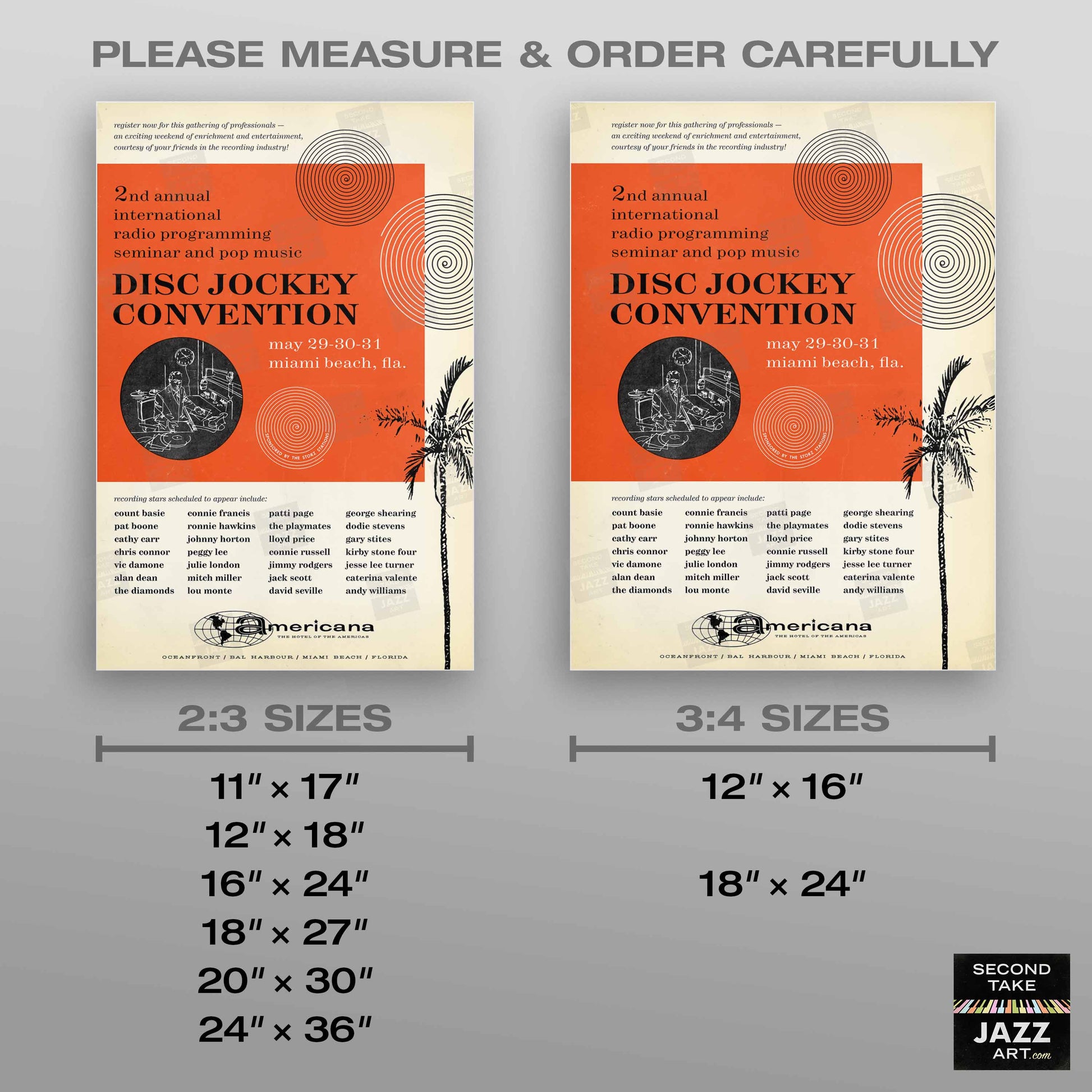 5) Perfectly imperfect. In general, our posters look what we like to call "PERFECTLY IMPERFECT." The events they publicize occurred in the distant past, and therefore the original source materials from which they derive often include not-so-minor COSMETIC FLAWS — folds, creases, scratches, spots, marks, smears, ghosting, discolorations, printing glitches, etc. In addition, some of the primary vintage advertising pieces contain TYPESETTING ERRORS — mistakes, typos, misspellings, etc. We elect to leave almost all of these issues INTACT. This serves to reflect the rushed nature of publicizing live jazz (with its often hurried programming and last-minute personnel changes), and when names are misspelled, these goofs reveal how some of the now-famous participants were still relatively early in their careers and not yet widely known. We always aim to strike a balance when preparing these "antique" materials for modern printing — holding onto their nostalgic, vintage-looking charm as much as possible — "warts and all" — while fixing issues primarily when they significantly hinder legibility. (Please be sure to ZOOM IN on our preview images to examine each poster closely.)
