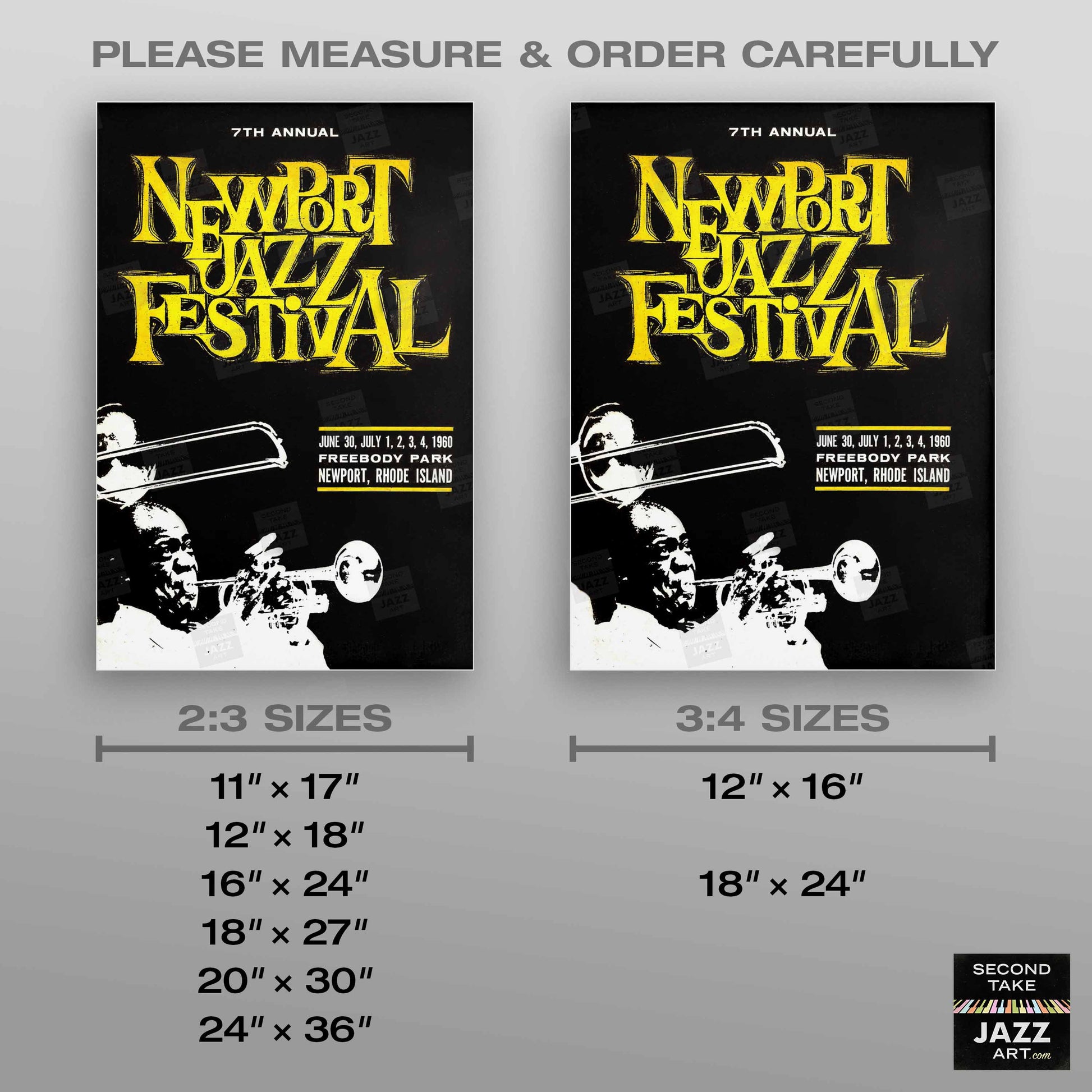5) Perfectly imperfect. In general, our posters look what we like to call "PERFECTLY IMPERFECT." The events they publicize occurred in the distant past, and therefore the original source materials from which they derive often include not-so-minor COSMETIC FLAWS — folds, creases, scratches, spots, marks, smears, ghosting, discolorations, printing glitches, etc. In addition, some of the primary vintage advertising pieces contain TYPESETTING ERRORS — mistakes, typos, misspellings, etc. We elect to leave almost all of these issues INTACT. This serves to reflect the rushed nature of publicizing live jazz (with its often hurried programming and last-minute personnel changes), and when names are misspelled, these goofs reveal how some of the now-famous participants were still relatively early in their careers and not yet widely known. We always aim to strike a balance when preparing these "antique" materials for modern printing — holding onto their nostalgic, vintage-looking charm as much as possible — "warts and all" — while fixing issues primarily when they significantly hinder legibility. (Please be sure to ZOOM IN on our preview images to examine each poster closely.)