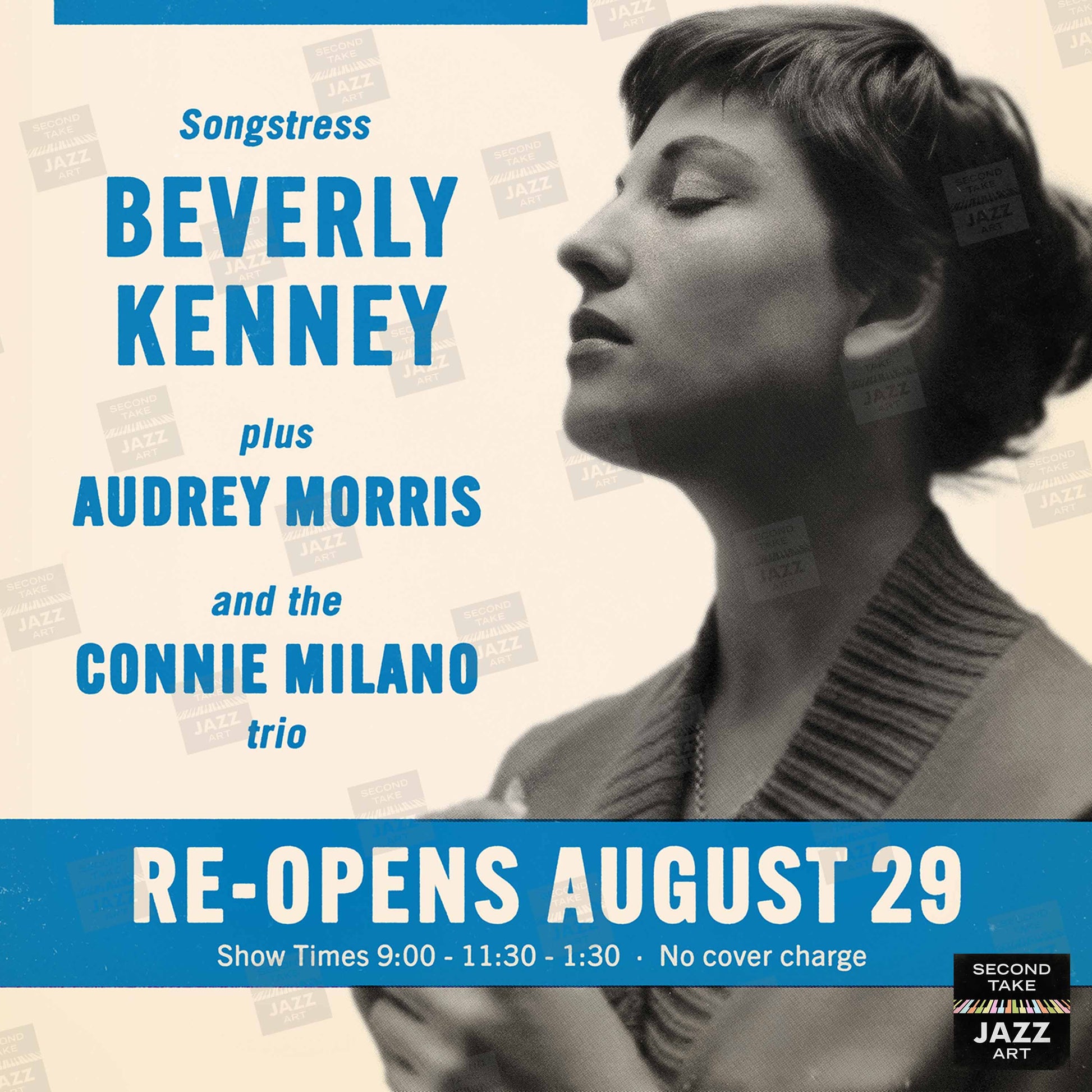 Something of a cult figure today (especially in Japan!), the plaintive jazz singer Beverly Kenney had an extremely short career (she died in 1960 at age 28, her life tragically cut short by mental health issues). But her cool, playful, and rather bittersweet voice continues to enchant listeners and influence singers to this day. When Mister Kelly's re-opened in late summer 1956 following a months-long closure after a fire, the owners celebrated the occasion with a triple bill featuring young Miss Kenney as the headliner, just as her star was on the rise. (She'd earned her stripes singing with Tommy and Jimmy Dorsey and gigging with Lester Young at Birdland — and she'd recorded her landmark album "Beverly Kenney Sings for Johnny Smith" just months before!)