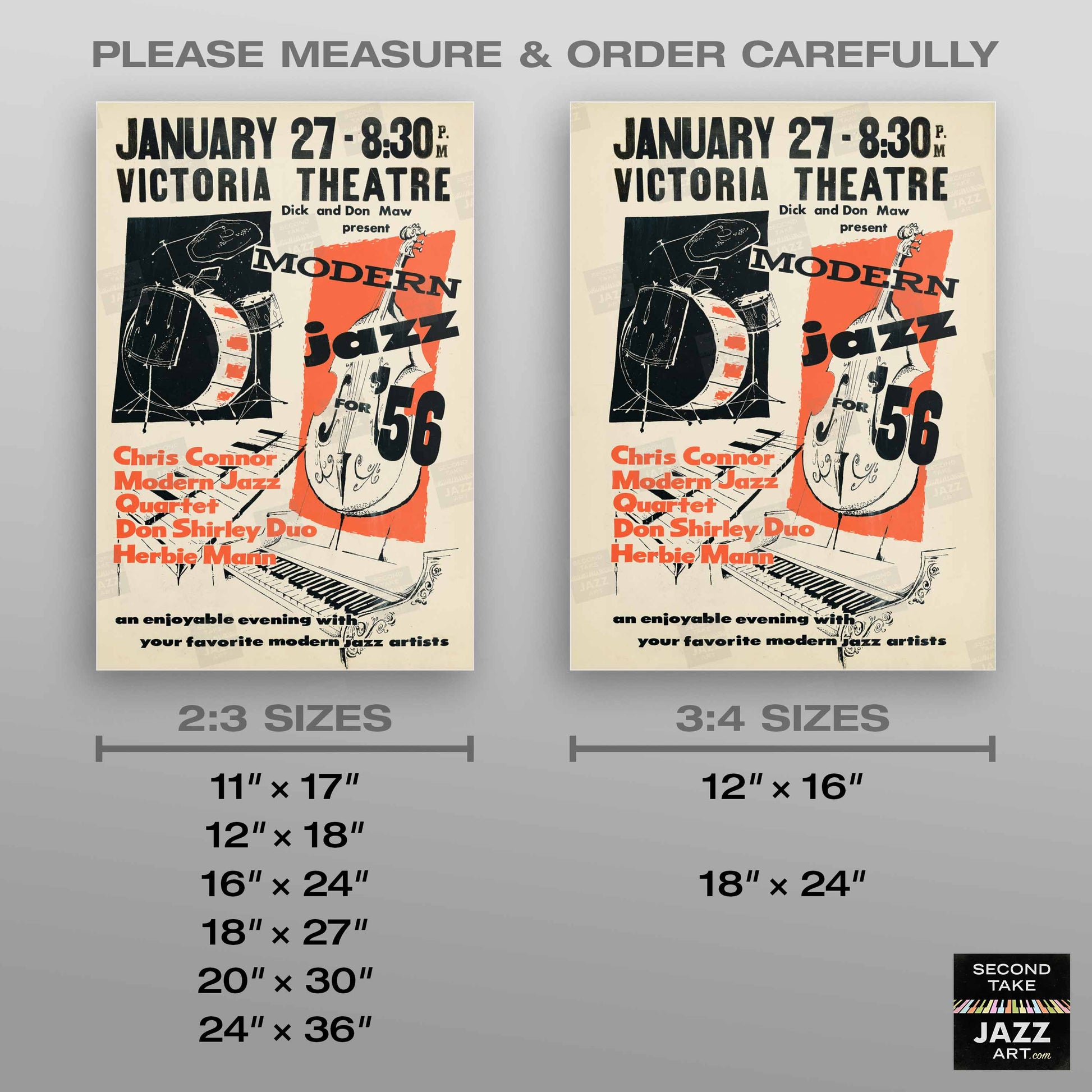 Our mission at SecondTakeJazzArt is to produce high-quality visuals that commemorate celebrated live performances by jazz legends from the distant past. We particularly focus on renowned club or concert appearances that have been preserved by fan-favorite recordings — legendary shows for which little to no advertising ephemera survives (or was ever created).
