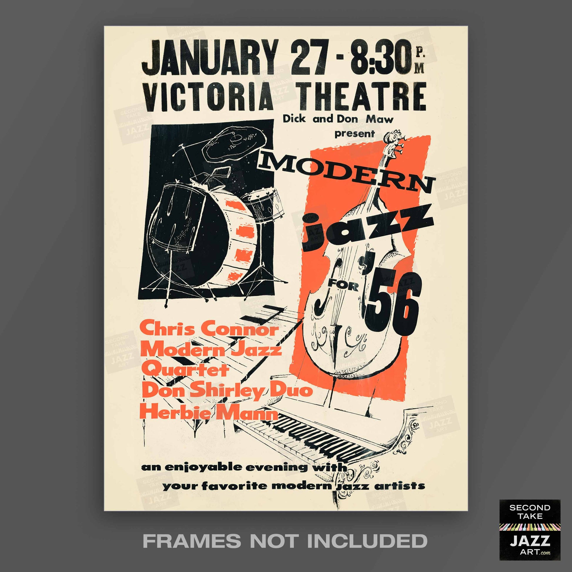 a high-quality unframed poster featuring original upgraded artwork commemorating a 1956 touring show of "modern jazz" legends:
