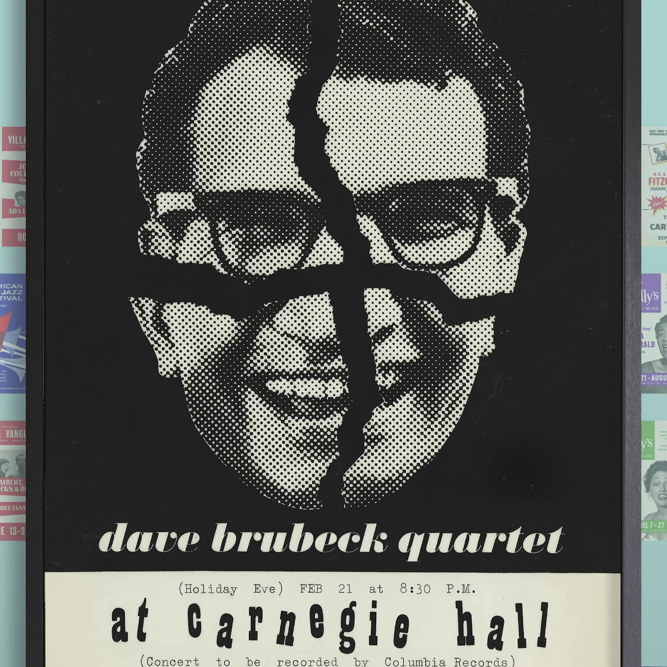 Note: This eye-catching poster features a portrait of Dave Brubeck's head, strikingly torn into four pieces to represent the members of the quartet, and funky typewriter-style text — a classic example of early 1960s graphic design.