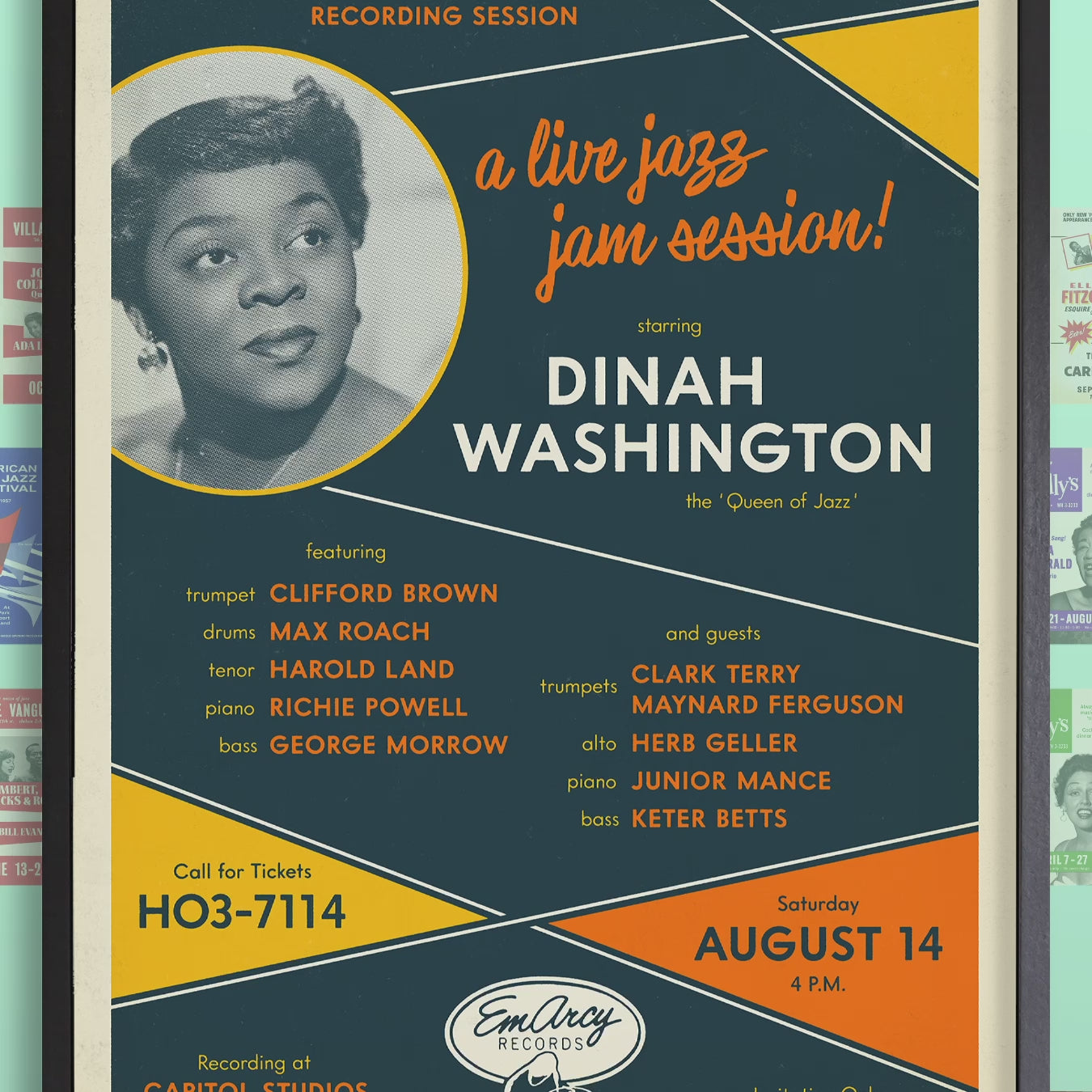 SecondTakeJazzArt strives to fill in these gaps with carefully researched, highly detailed facsimiles of said missing ephemera. Our poster designs combine the verifiable performance information with vintage source materials (imagery, branding, type, etc.) and original elements (derived from or inspired by contemporaneous advertisements of the same/similar events in posters, handbills, newspapers, magazines, festival programs, album covers, etc.).