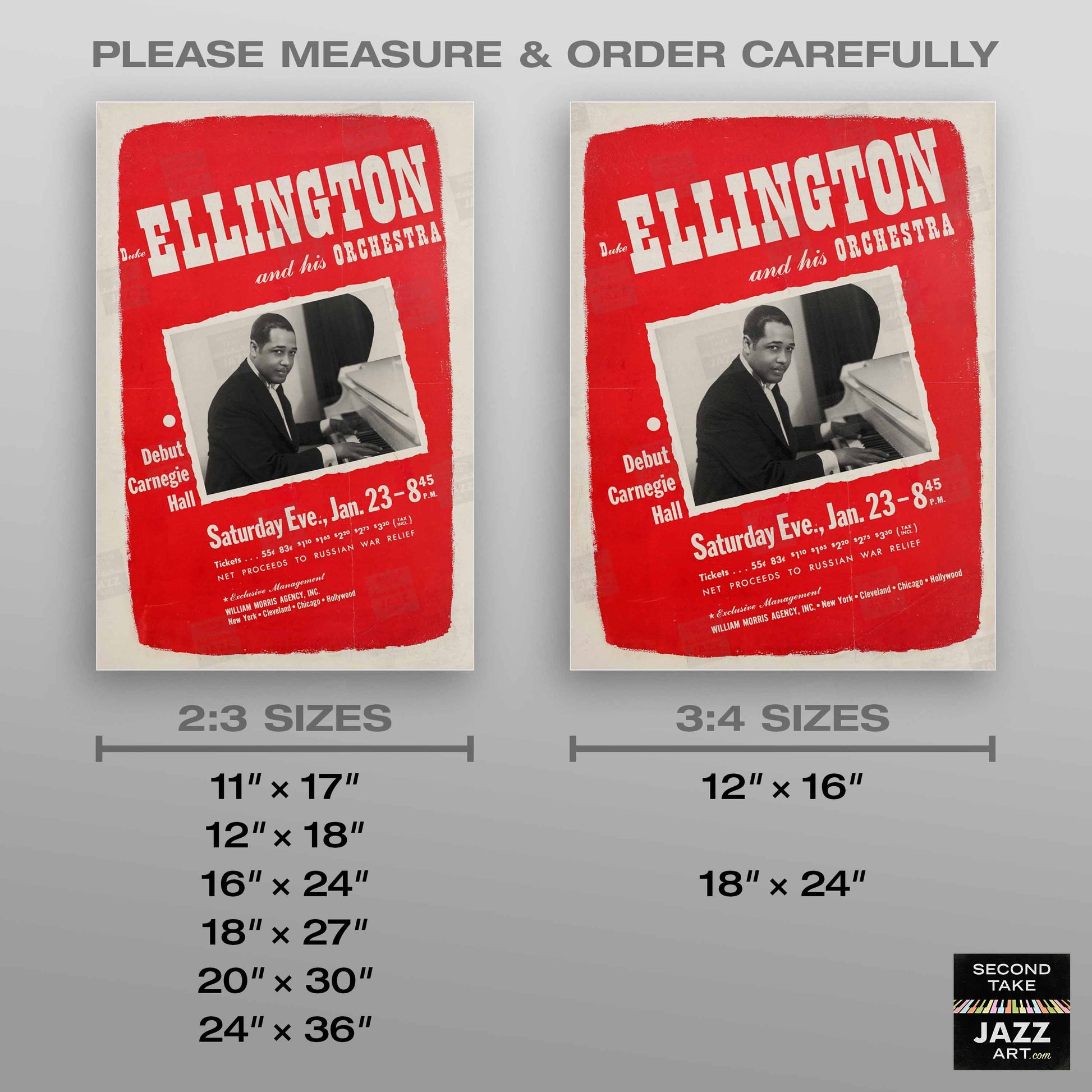 5) Perfectly imperfect. In general, our posters look what we like to call "PERFECTLY IMPERFECT." The events they publicize occurred in the distant past, and therefore the original source materials from which they derive often include not-so-minor COSMETIC FLAWS — folds, creases, scratches, spots, marks, smears, ghosting, discolorations, printing glitches, etc. In addition, some of the primary vintage advertising pieces contain TYPESETTING ERRORS — mistakes, typos, misspellings, etc. We elect to leave almost all of these issues INTACT. This serves to reflect the rushed nature of publicizing live jazz (with its often hurried programming and last-minute personnel changes), and when names are misspelled, these goofs reveal how some of the now-famous participants were still relatively early in their careers and not yet widely known. We always aim to strike a balance when preparing these "antique" materials for modern printing — holding onto their nostalgic, vintage-looking charm as much as possible — "warts and all" — while fixing issues primarily when they significantly hinder legibility. (Please be sure to ZOOM IN on our preview images to examine each poster closely.)