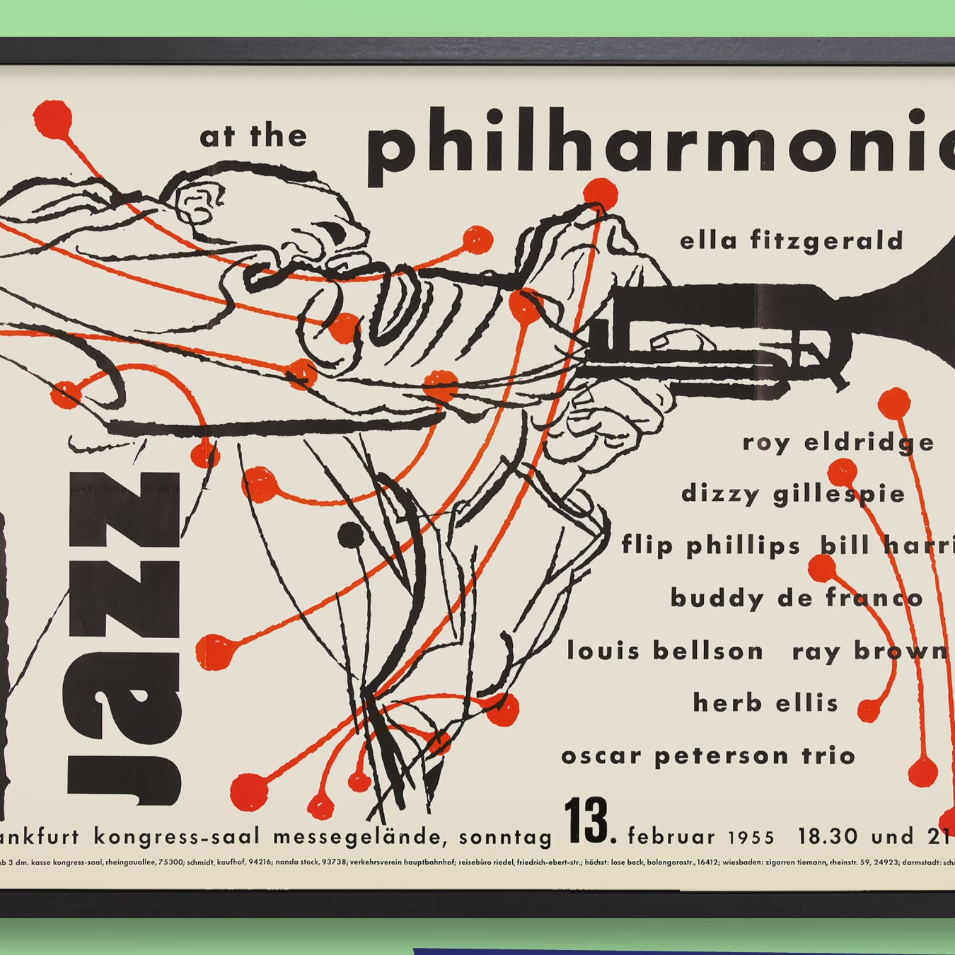 A true exemplar of mid-century modern graphic design, this 1955 German poster combines David Stone Martin's iconic trumpeter illustration (the de facto "logo" for JATP); Calder-esque barbells, whose dynamic dots and arcs serve to connect the elements and draw the eye; bold, modern European typography; and the classically stark black-and-red color palette. A beauty!