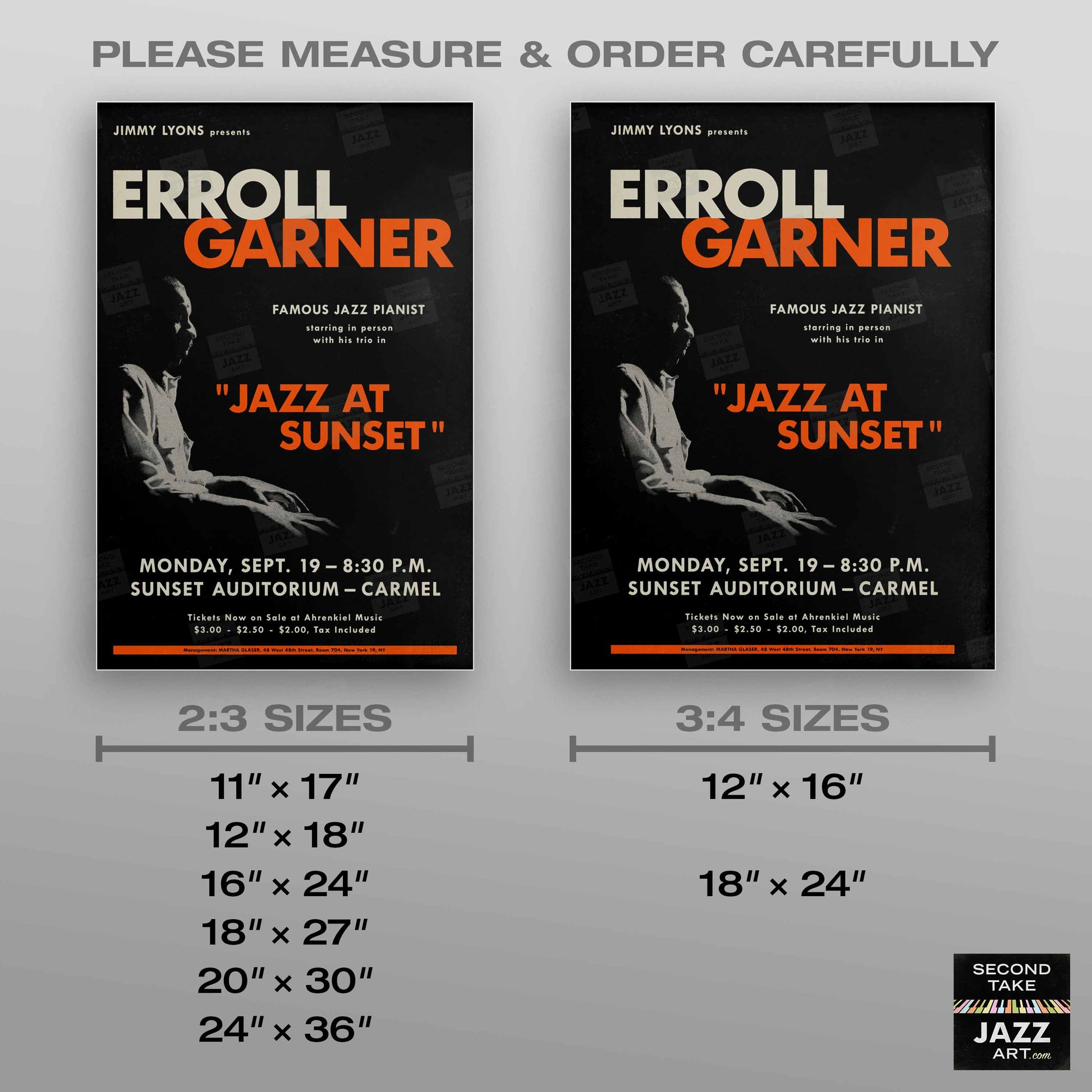 Our mission at SecondTakeJazzArt is to produce high-quality visuals that commemorate celebrated live performances by jazz legends from the distant past. We particularly focus on renowned club or concert appearances that have been preserved by fan-favorite recordings — legendary shows for which little to no advertising ephemera survives (or was ever created).
