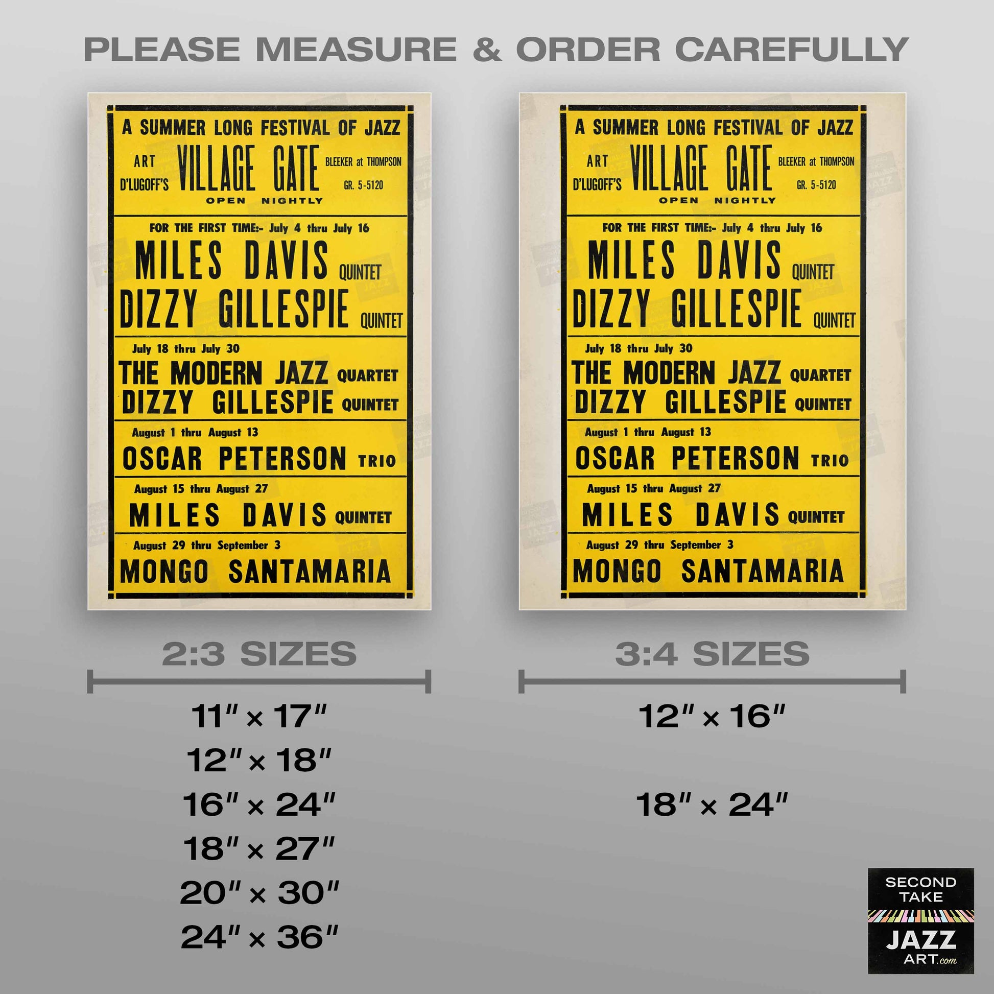 5) Perfectly imperfect. In general, our posters look what we like to call "PERFECTLY IMPERFECT." The events they publicize occurred in the distant past, and therefore the original source materials from which they derive often include not-so-minor COSMETIC FLAWS — folds, creases, scratches, spots, marks, smears, ghosting, discolorations, printing glitches, etc. In addition, some of the primary vintage advertising pieces contain TYPESETTING ERRORS — mistakes, typos, misspellings, etc. We elect to leave almost all of these issues INTACT. This serves to reflect the rushed nature of publicizing live jazz (with its often hurried programming and last-minute personnel changes), and when names are misspelled, these goofs reveal how some of the now-famous participants were still relatively early in their careers and not yet widely known. We always aim to strike a balance when preparing these "antique" materials for modern printing — holding onto their nostalgic, vintage-looking charm as much as possible — "warts and all" — while fixing issues primarily when they significantly hinder legibility. (Please be sure to ZOOM IN on our preview images to examine each poster closely.)