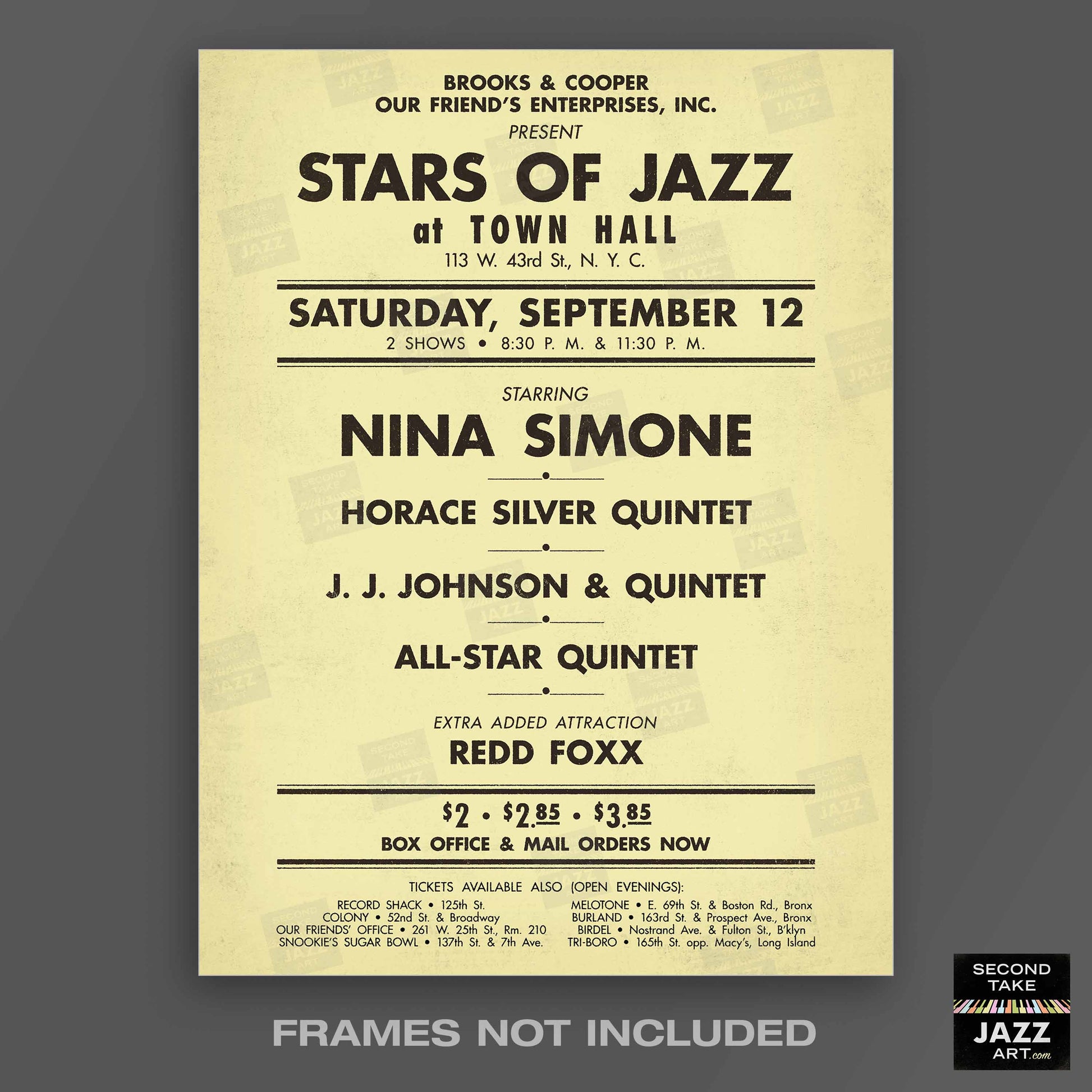 Our mission at SecondTakeJazzArt is to produce high-quality visuals that commemorate celebrated live performances by jazz legends from the distant past. We particularly focus on renowned club or concert appearances that have been preserved by fan-favorite recordings — legendary shows for which little to no advertising ephemera survives (or was ever created).