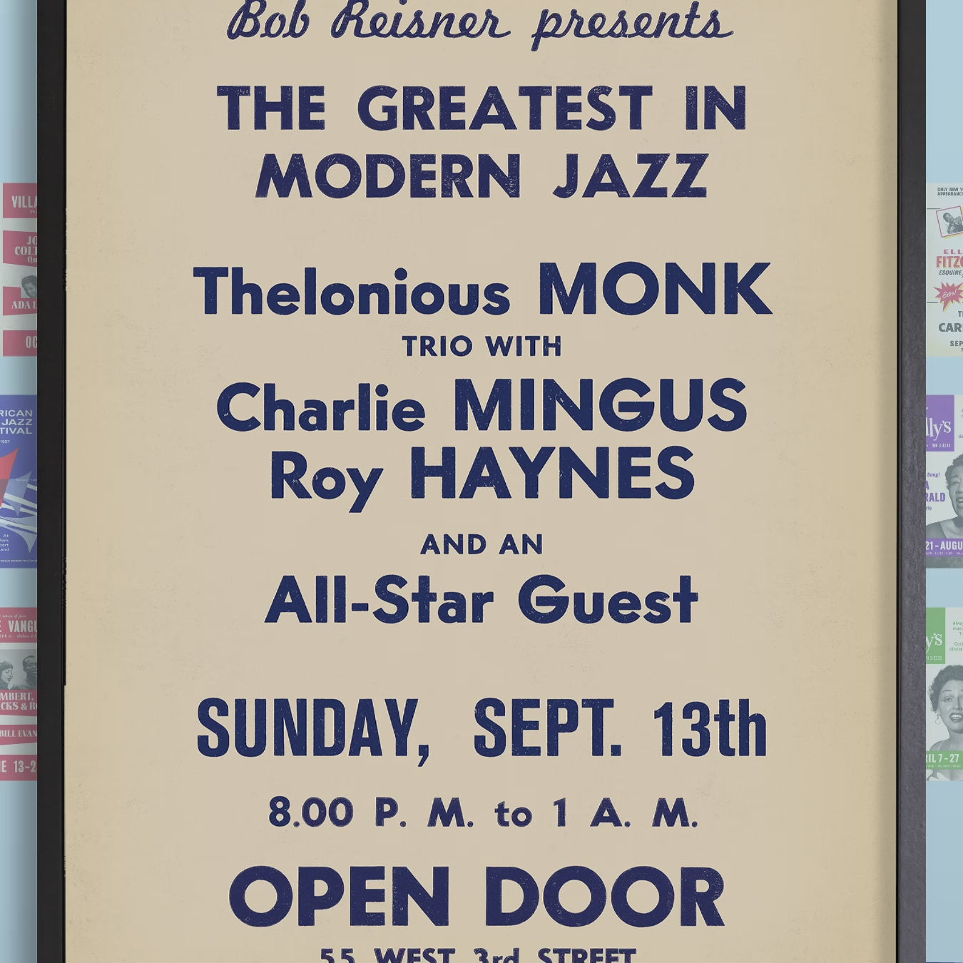 Our mission at SecondTakeJazzArt is to produce high-quality visuals that commemorate celebrated live performances by jazz legends from the distant past. We particularly focus on renowned club or concert appearances that have been preserved by fan-favorite recordings — legendary shows for which little to no advertising ephemera survives (or was ever created).