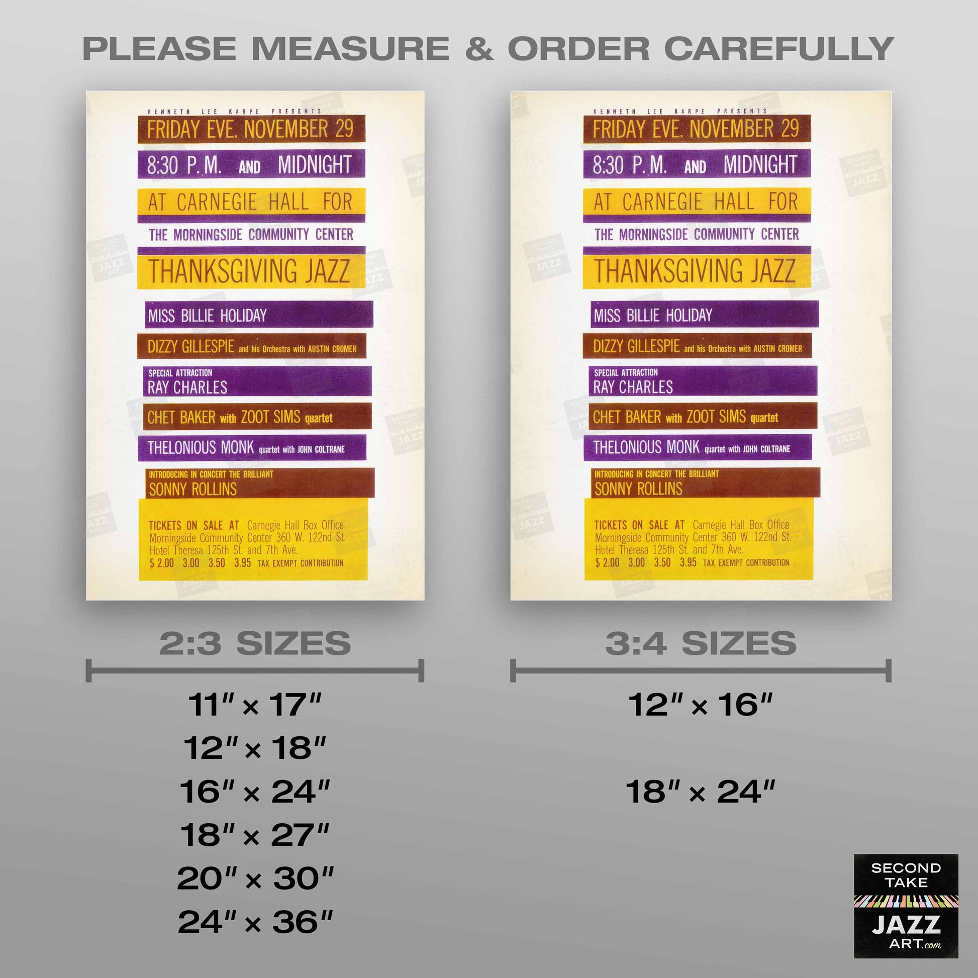 5) Perfectly imperfect. In general, our posters look what we like to call "PERFECTLY IMPERFECT." The events they publicize occurred in the distant past, and therefore the original source materials from which they derive often include not-so-minor COSMETIC FLAWS — folds, creases, scratches, spots, marks, smears, ghosting, discolorations, printing glitches, etc. In addition, some of the primary vintage advertising pieces contain TYPESETTING ERRORS — mistakes, typos, misspellings, etc. We elect to leave almost all of these issues INTACT. This serves to reflect the rushed nature of publicizing live jazz (with its often hurried programming and last-minute personnel changes), and when names are misspelled, these goofs reveal how some of the now-famous participants were still relatively early in their careers and not yet widely known. We always aim to strike a balance when preparing these "antique" materials for modern printing — holding onto their nostalgic, vintage-looking charm as much as possible — "warts and all" — while fixing issues primarily when they significantly hinder legibility. (Please be sure to ZOOM IN on our preview images to examine each poster closely.)